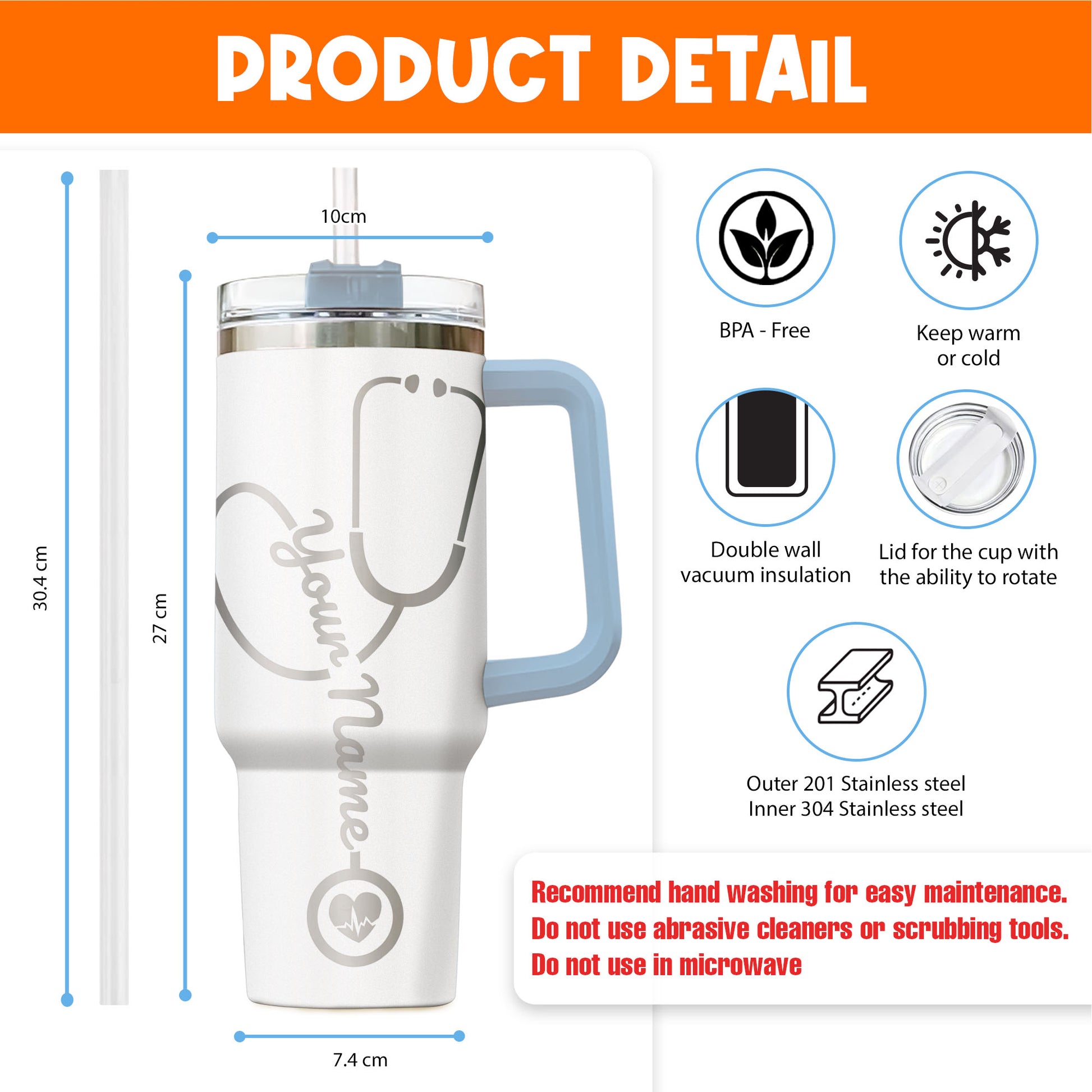 Built for all-day hydration, this tumbler keeps drinks hot or cold for hours with double-wall insulation. The stainless steel body, comfortable handle, and cup-holder friendly base make it your go-anywhere companion — home, office, gym, travel, or car.